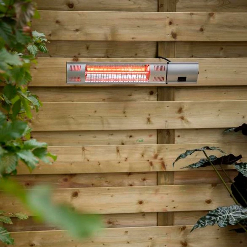 Sølvfarvet infrarød terrassevarmer til ophæng på væg. Perfekt til terrassen eller altanen og kan varme op til 22m2, så du kan få mere ud af sommeraftenerne. (Læs mere)