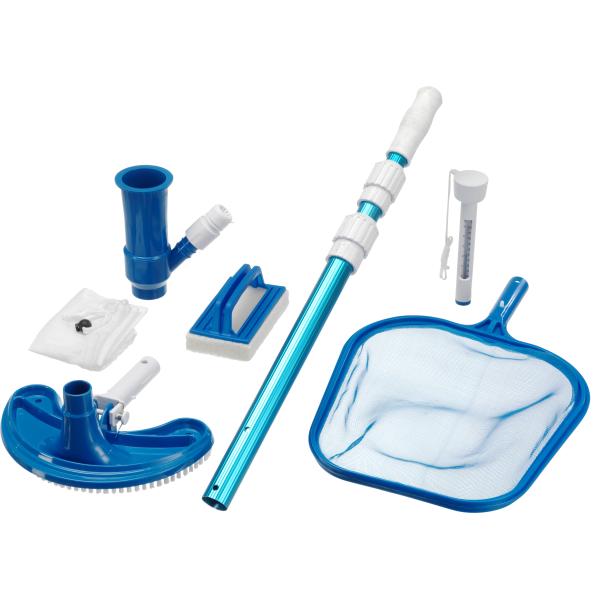Alt det basale tilbehør der er brug for, udover vandplejemidler, til at holde mindre pools og havebassiner i fin og badeklar stand.Sættet indeholder:- Bundsuger- Termometer- Teleskopstang 1,35 meter- Poolketcher- Poolsvamp (Læs mere)
